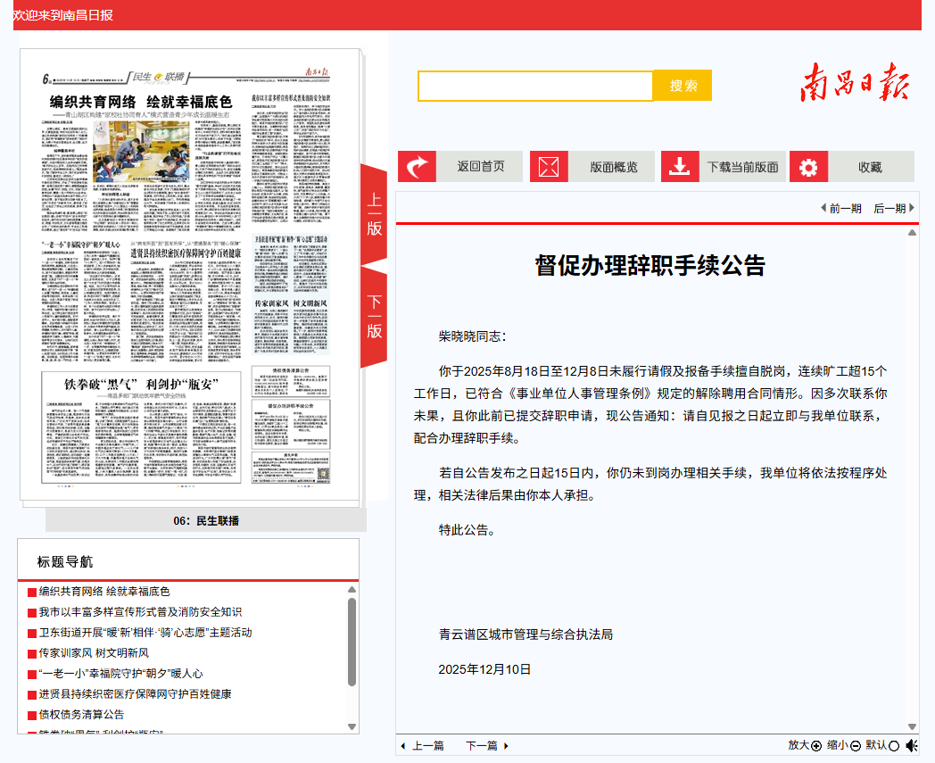 江西南昌市青云谱区城市管理与综合执法局12月10日在《南昌日报》刊发《督促办理辞职手续公告》。